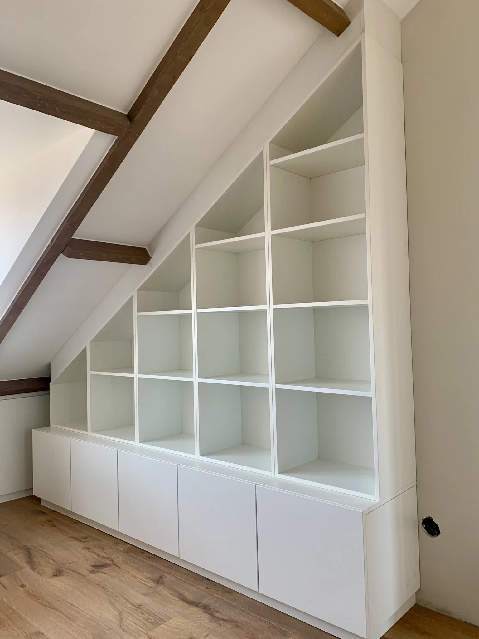 Boekenkast onder schuine wand Ruimtebesparende witte boekenkast met bergruimte. Opgebouwd in Finsa 030 plaatmateriaal boekenkast, MaatwerkIngrid Serraarens8 juli 2025 Facebook0 0 Likes