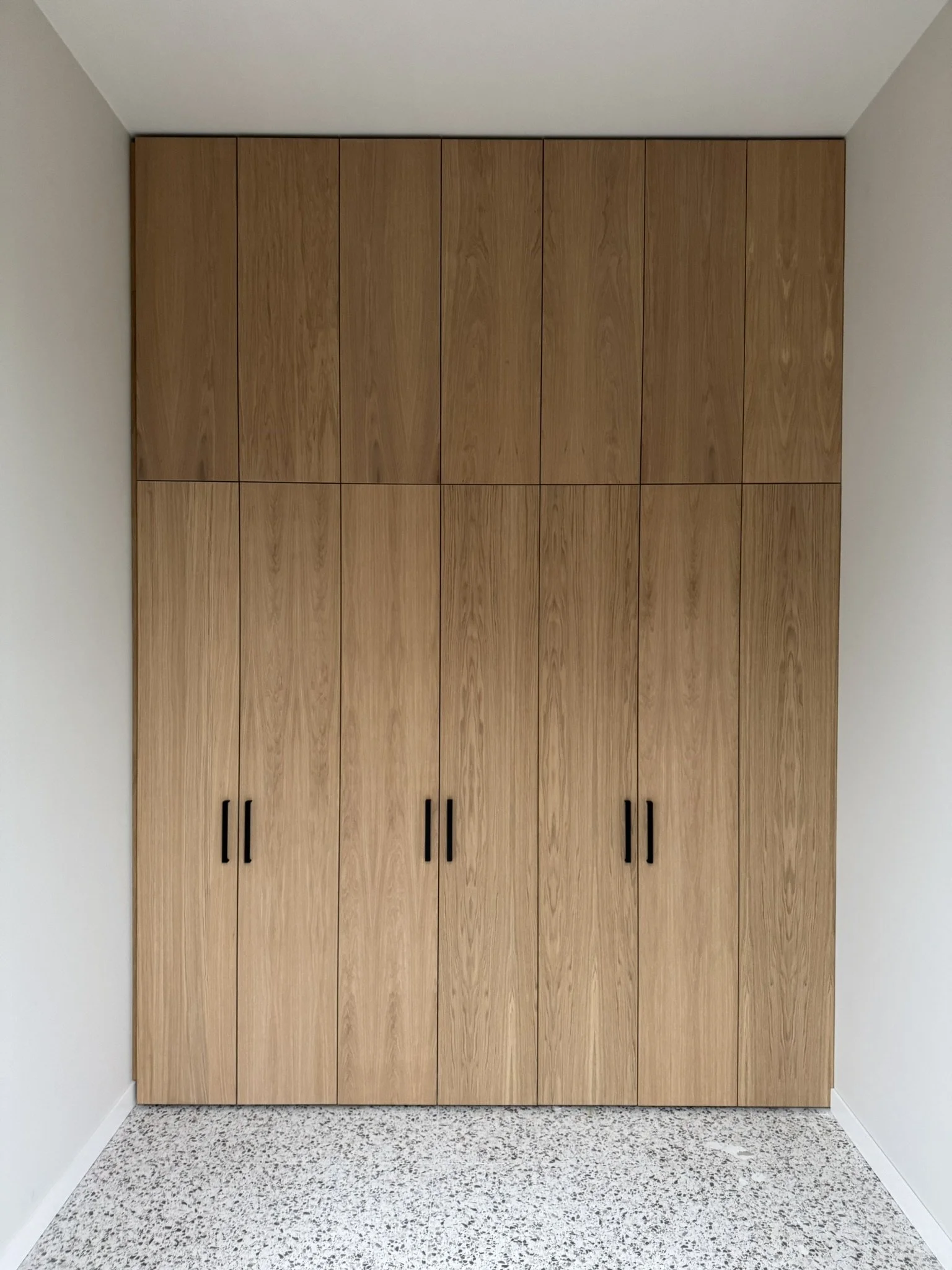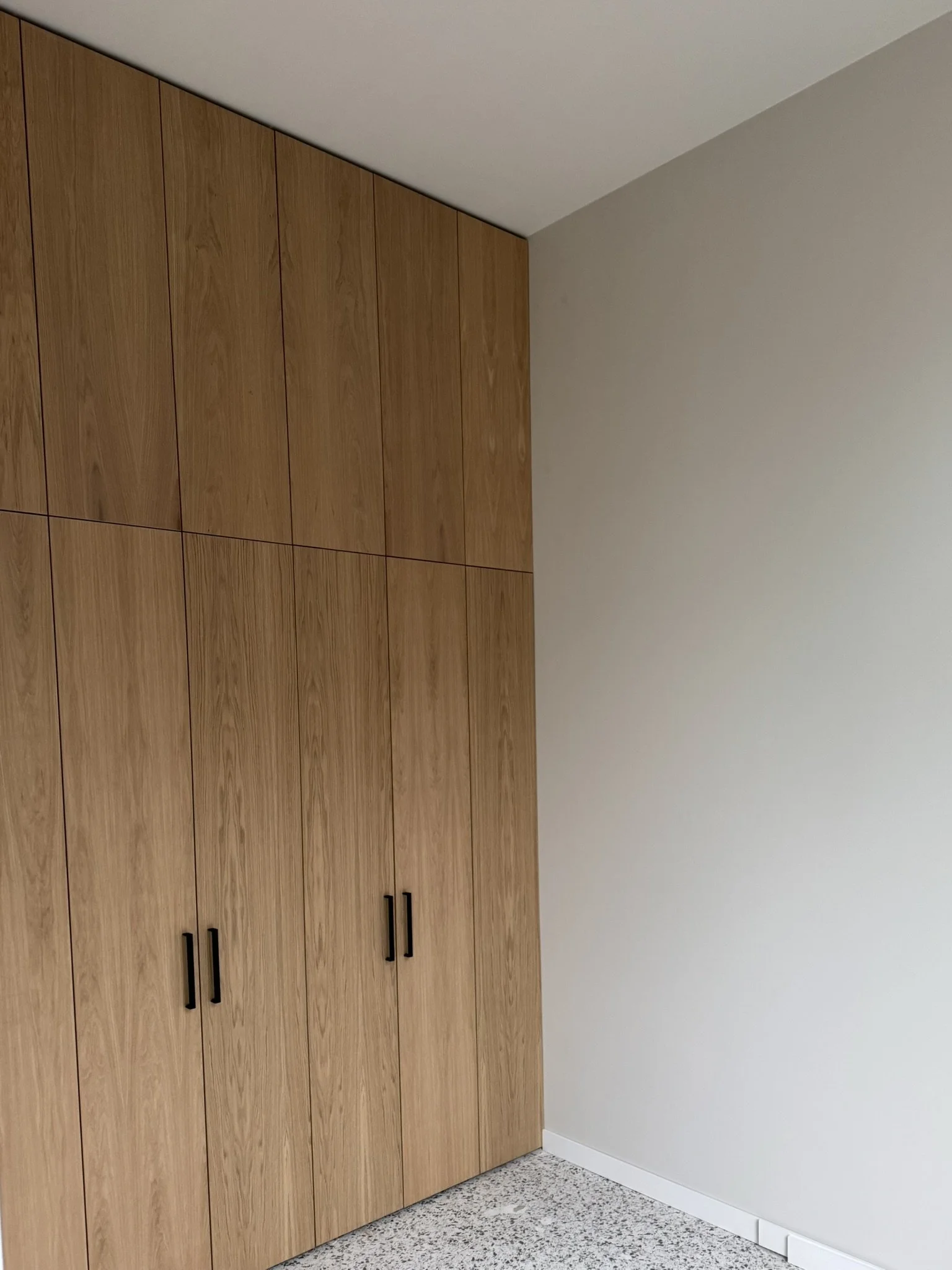Uitgevoerd in wit geolied eiken. De totale kast is bijna 4 meter hoog.
