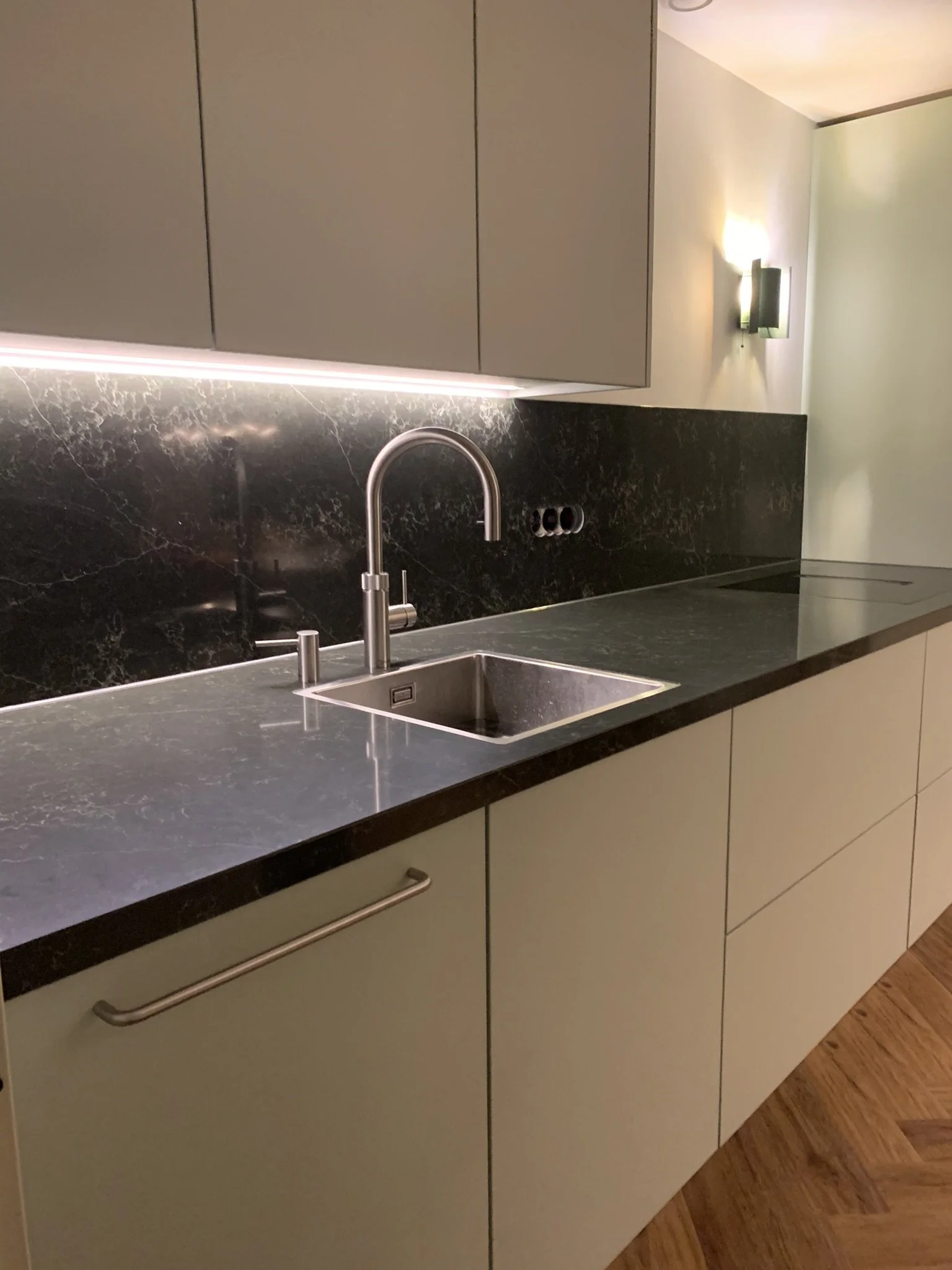 Minimale keuken afgewerkt met donkergroen natuursteen Strakke keuken, voorzien van Amerikaanse koelkast. Uitgevoerd in lichtgroen plaatmateriaal. Ingrid Serraarens8 juli 2025 Facebook0 0 Likes