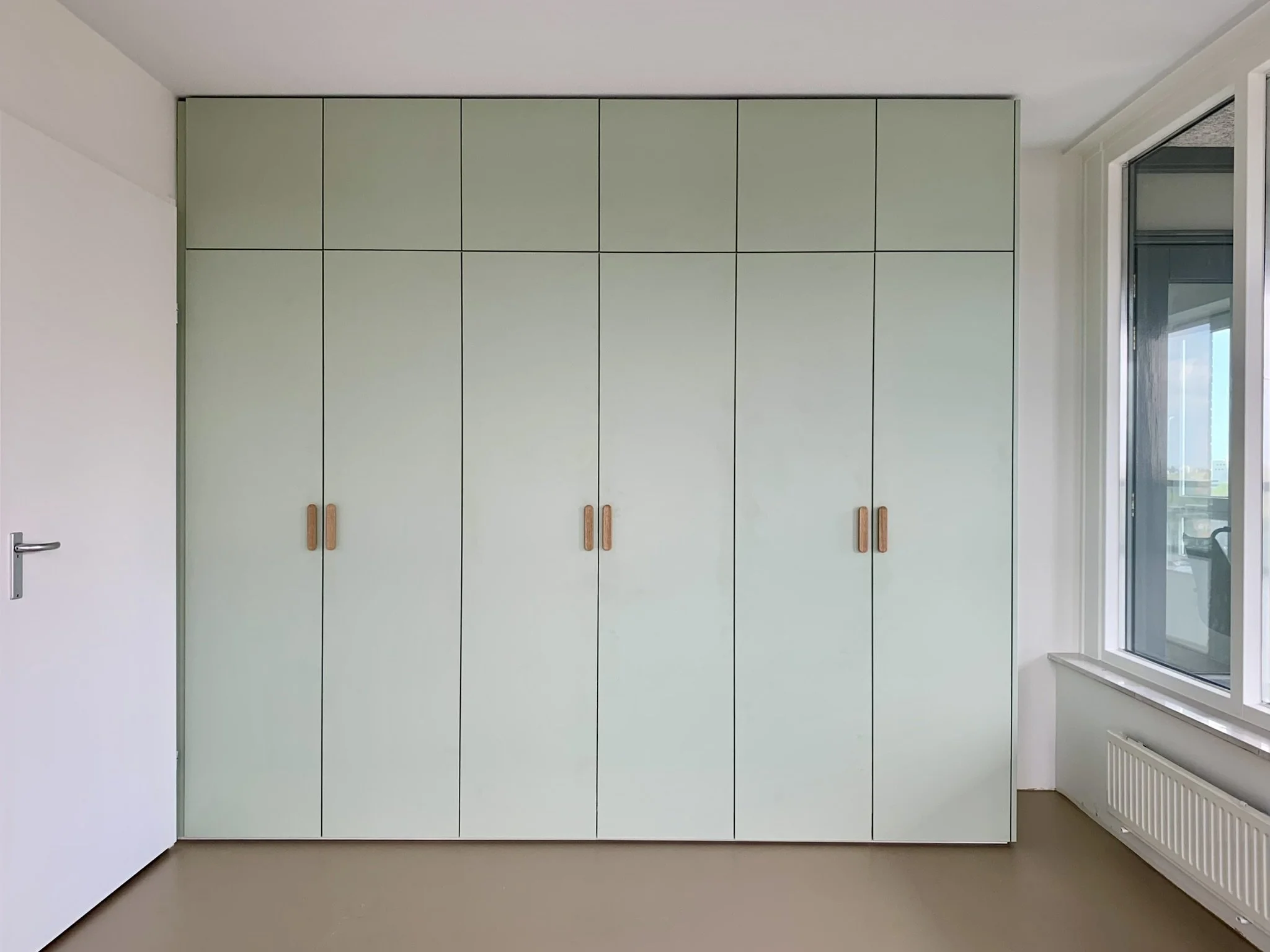 Saliegroene kledingkast met houten grepen Voorzien van afgeronde eiken grepen biedt deze kast veel ruimte voor al je kleding. kledingkast, MaatwerkIngrid Serraarens8 juli 2025 Facebook0 0 Likes