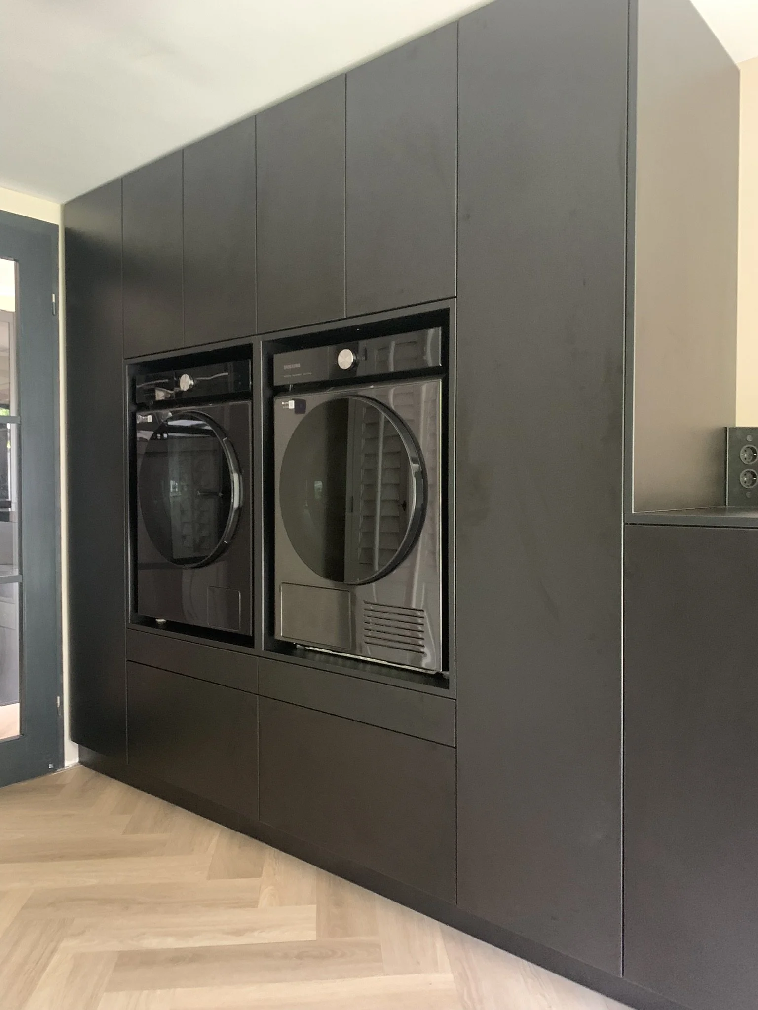 Zwarte kledingkast met geintegreerde apparatuur Zwarte kast in een bijkeuken, die plaats biedt aan wasmachine en droger. kledingkastIngrid Serraarens8 juli 2025 Facebook0 0 Likes